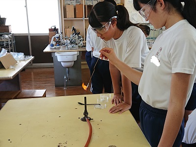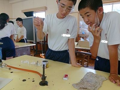 1年生は理科で「物の燃え方」について学習しています。食塩、砂糖、小麦粉を加熱するとどうなるか検証実験を行いました。