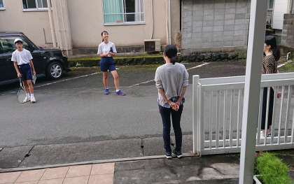 生活健康委員の生徒と教員が玄関先で「朝のあいさつ運動」を行っています。生徒同士で元気に声を掛け合っていました。