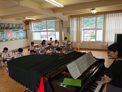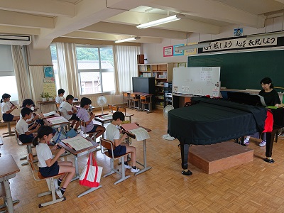 戸田小の5年生が音楽室で音楽の学習を行っていました。小針教諭が小学生に対してリコーダー指導をしていました。