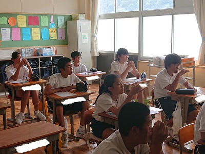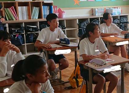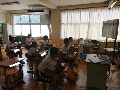 1年生は道徳で「ぼくらの村の未来」をテーマとして、村人になったつもりで村の将来を考え話し合いました。最初に大型提示装置でビデオを見ました。