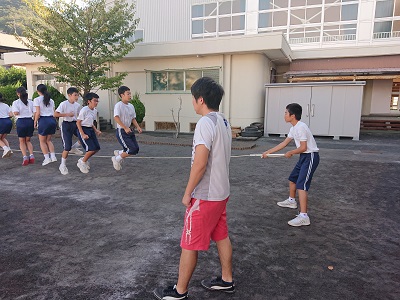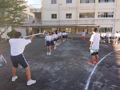1年生は潮風祭に向けて、大縄練習を行いました。教員も一緒になって声をかけ、生徒のがんばりを応援しています。