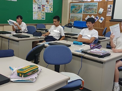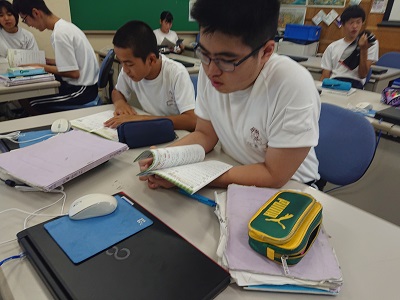 3年生は英語で既習事項を使った英文の読み取りをペアと行っていました。