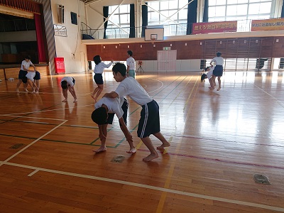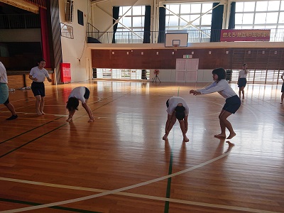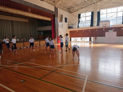 1年生は体育でソーラン節の練習をしました。最初に基礎基本の運動を行いました。
