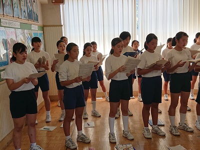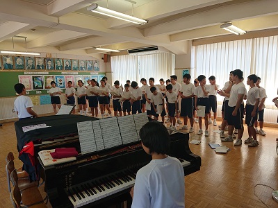 3年生を中心に全校合唱練習を行っています。全員できれいなハーモニーを奏でています。