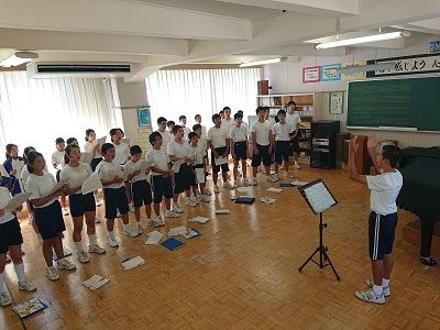 3年生を中心に全校合唱練習を行っています。全員できれいなハーモニーを奏でています。