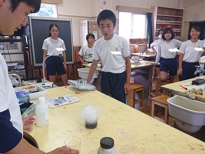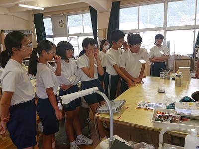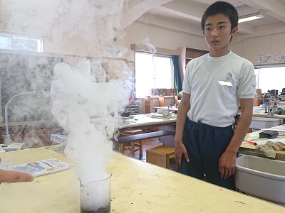 1年生は理科で「気体の性質を調べよう」という活動を行っていました。最初に教師が行う実験をみんなで観察していました。