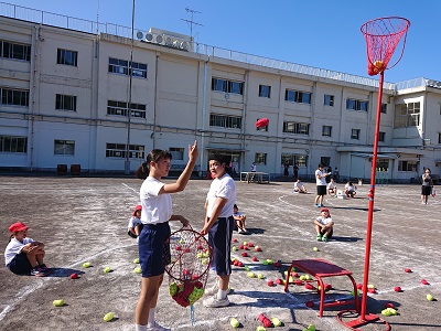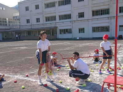 玉入れ競技では中学生のお兄さん、お姉さんがかごに入った数を数えます。