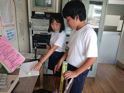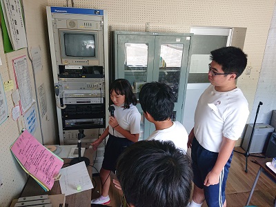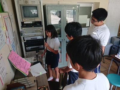 昼の放送の様子です。小中の放送(広報)委員が毎日担当して、すてきな放送を行っています。中学生が小学生の放送担当を見守っています。
