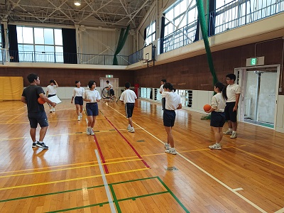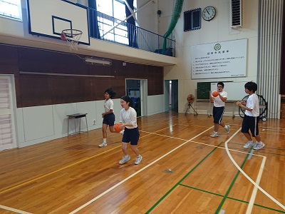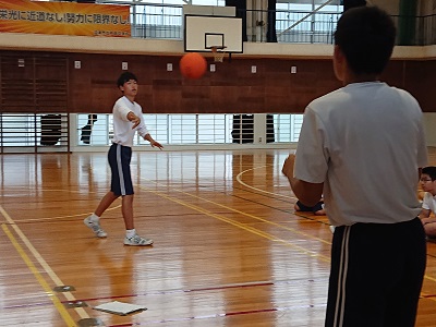 3年生は体育で「ハンドボール」について学習しています。ハンドボールの仕方やルールについて確認した後、実際にパス練習から始めました。