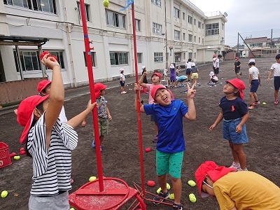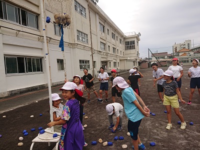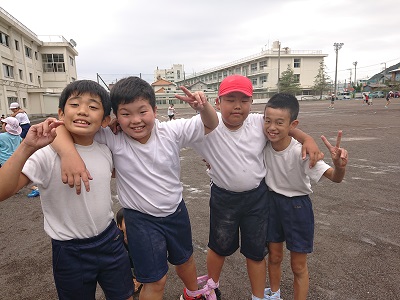 昼休みの様子です。中学生は体育館で合唱練習、小学生はグラウンドで運動会の練習に励んでいます。