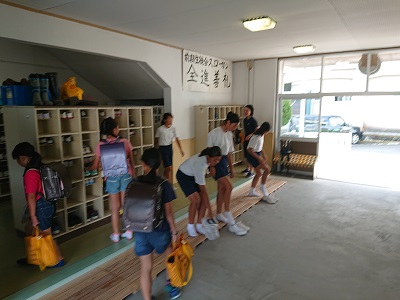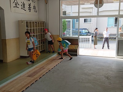 児童生徒の登校の様子です。小中教職員が子どもたちを昇降口で迎えます。