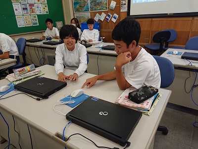 1年生は英語で既習事項の復習を行っていました。「3人称単数現在形って?」とペアで確認しあっていました。
