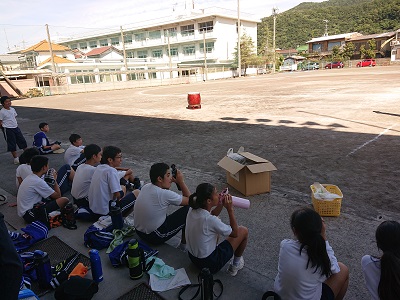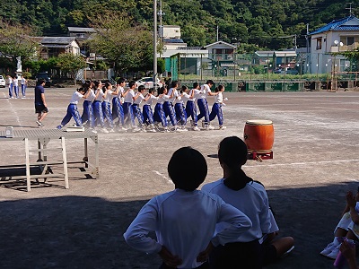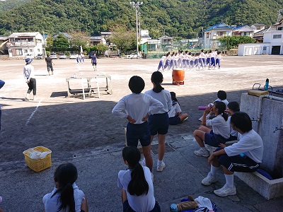 応援練習の後はムカデ練習を行いました。相手チームの動向が気になるようで、みんな相手チームを観察していました。