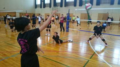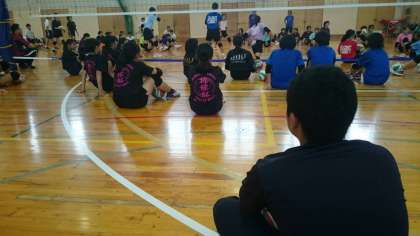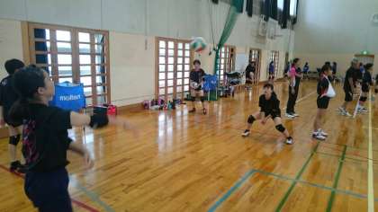 男女バレーボール部はバレーボール講習会に参加しています。基本のトレーニングから始め、技術向上のための練習をたくさん教わっています。