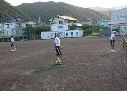 ソフトテニス部の朝練習の様子です。朝の歌練習前にたくさんの打ち込みを行っています。