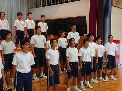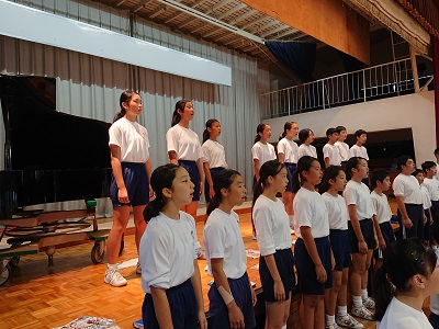 昼休みは、潮風祭に向けて全校合唱の練習をしました。3年生がリードして練習を進めました。