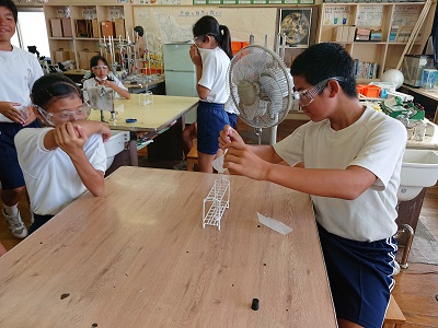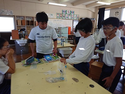 1年生は理科で「いろいろな気体」について学習しています。酸素や二酸化炭素以外にどんな気体があるかを予想した後、アンモニアを発生させ、その臭いや特徴について確認しました。