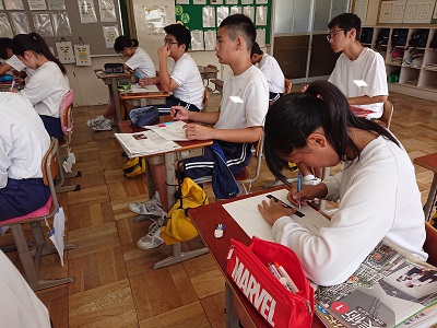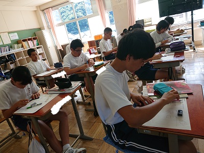 3年生は美術で「線遠近法(透視図法)」について学習していました。二点透視図法の描き方をマスターしていました。