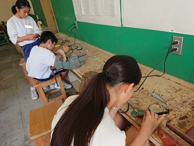 2年生は技術でドーム調光スタンドを作成しています。今日はプリント基板の制作において、「はんだ」と「はんだごて」を使って、「はんだ付け」を行いました。