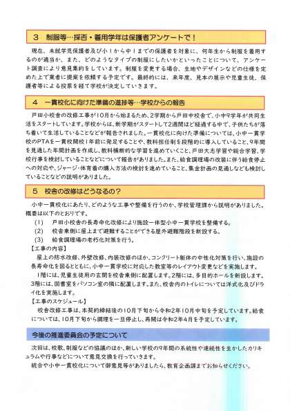 先日、「戸田地区小中一貫校推進委員会たより第9号」を配布させていただきました。この号では、校歌・校章・制服などの進捗状況についてお知らせしています。