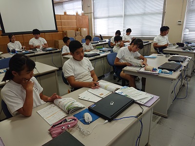 2年生は英語で単元のまとめを行っていました。既習事項についてワークノートを使って復習しました。