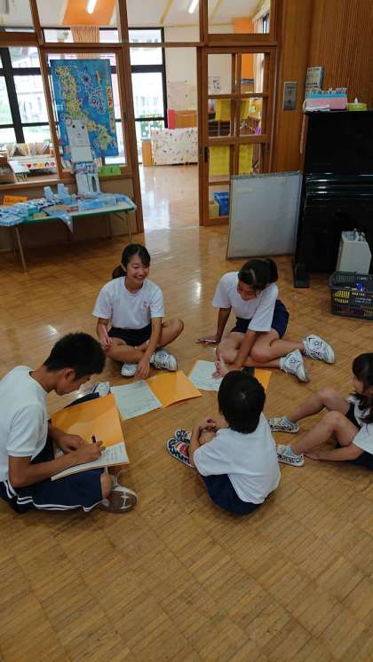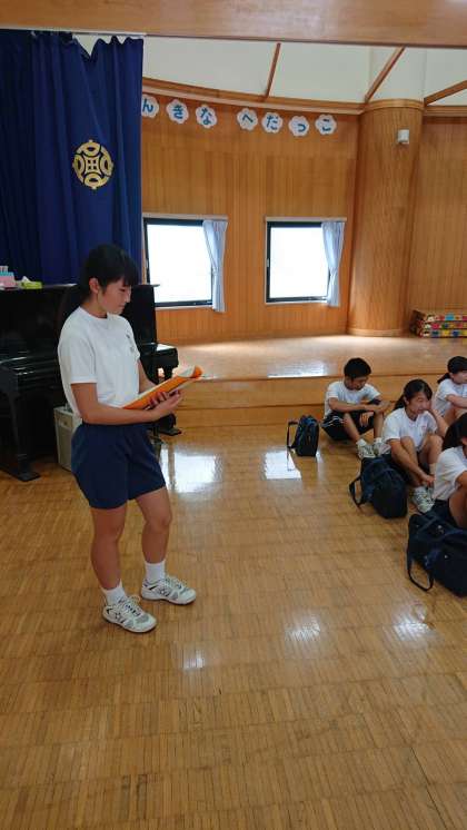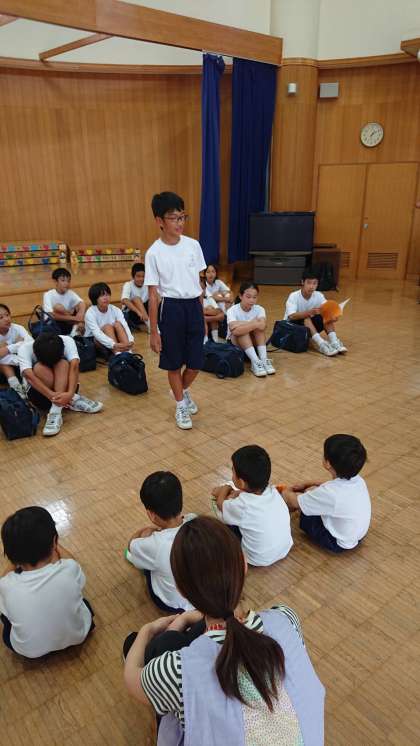 へだっこセンターに到着した1年生は、早速園児と交流です。自己紹介から始めました。