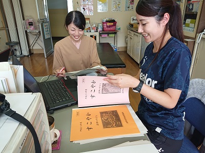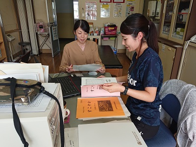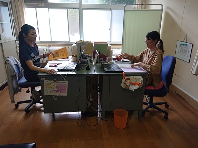 保健室の様子です。二人の養護教諭さんが小中児童生徒のために話し合ったり、子どもたちの健康を考える研修を行ったりしています。