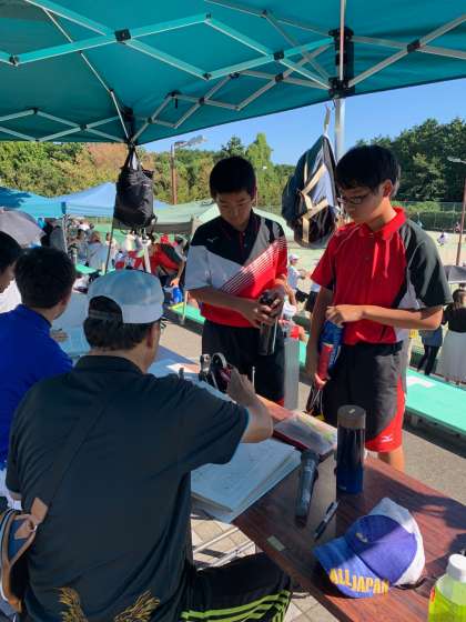 沼津市スポーツ祭ソフトテニス大会個人の部1回戦が行われています。1回戦を突破したペアはジャッジペーパーを持って大会本部に報告です。