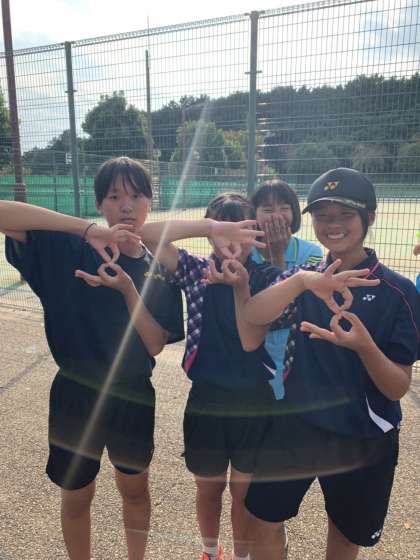 女子ソフトテニス2年生ペアは堂々のベスト8です。先輩や後輩が祝福しています。
