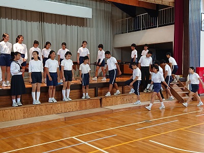 来週に迫った沼津市連合音楽会に向けて、体育館で全校生徒が朝練習を行いました。最初に入場練習から始めました。