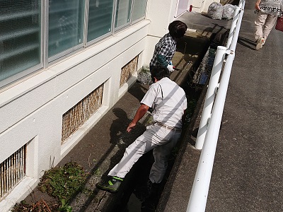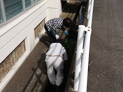 用務員さんとスクールサポートスタッフさんが体育館東側の側溝をきれいに整備しました。