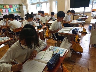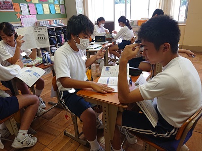 1年生の朝学習の様子です。中間テストに向けて個人で勉強したり、友達同士で教え合ったりしています。