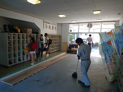 今朝の登校の様子です。玄関前では小中教職員が児童生徒を迎え入れます。