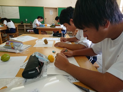 1年生は美術で「形と色で構成しよう」という教材を学習しています。野菜を手にとってじっくり観察しました。見る角度を変えるなどしながらスケッチに挑戦しました。