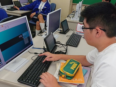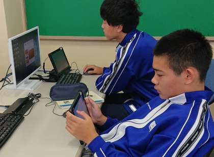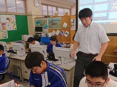 3年生は国語で「パネルディスカッション」を行っています。発表前の準備でパワーポイントの動きの確認をしていました。