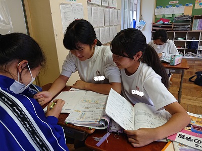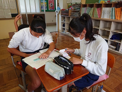 放課後、「助け合い学習」の様子です。中間テストに向けて、学力補充の時間にもなります。1年生は学年主任と学級担任が出張のため、渡部先生が担当として1年生の学習を見守っています。