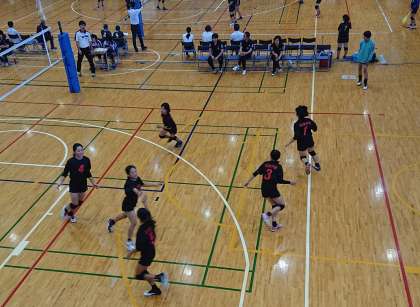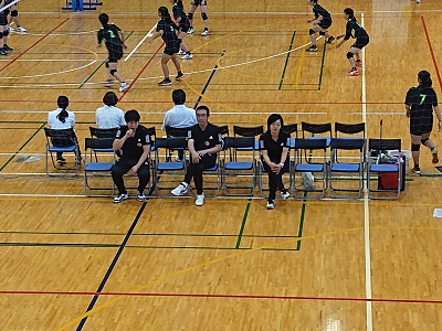 女子バレーボールは、石井先生、小学校の鈴木先生、山田コーチの3名体制で試合の展開を見守っています。