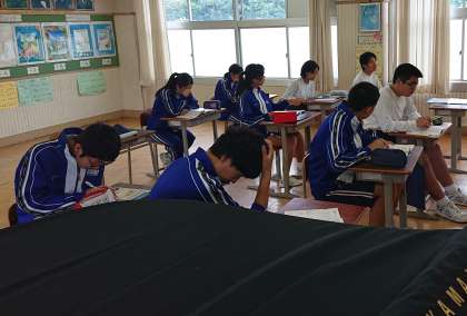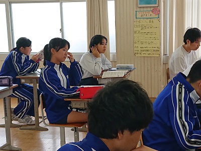 3年生は音楽で、明日の連合音楽会で披露する「COSMOS」について、歌詞の意味などから、どんなところに気をつけて歌いたいかを話し合っていました。