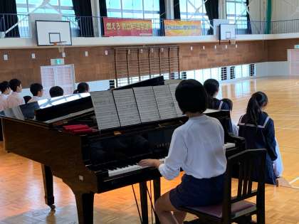 昼休み、体育館で明日の連合音楽会に向けて、1、3年生が合唱練習を行っていました。