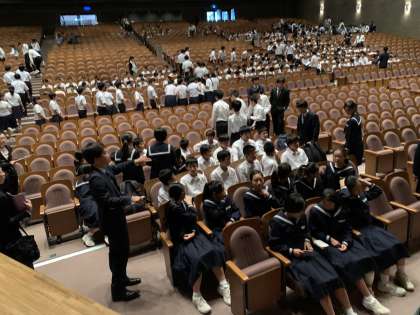 まもなく第70回沼津市連合音楽会が始まります。生徒は観覧席で待機しています。他校も続々と入場しています。