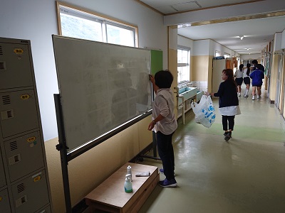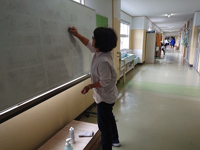 スクールサポートスタッフさんが、潮風祭、連合音楽会で使用したホワイトボードの汚れ落としを行いました。