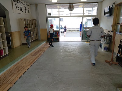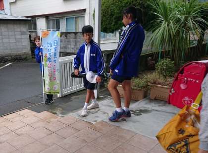 生活健康委員の生徒と教員、保護者が玄関先で「朝のあいさつ運動」を行いました。生徒同士で元気に声を掛け合っていました。