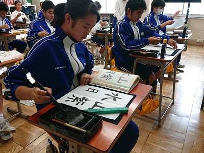 2年生は書写の時間において、毛筆を行っています。みんな一字一字丁寧に書いていました。