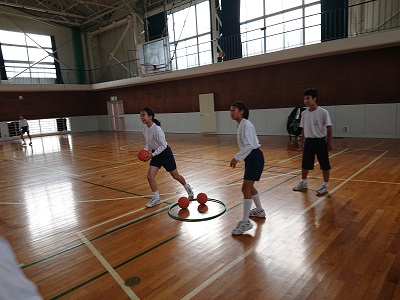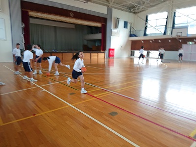 1年生は体育でボール運動を行いました。チーム対抗でボール運びゲームを楽しんでいました。