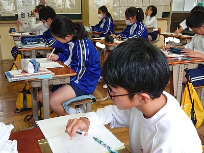 1年生は数学で「比例」について学習しています。「y=ax」の関係について、問題を解き分かったことを話し合いました。