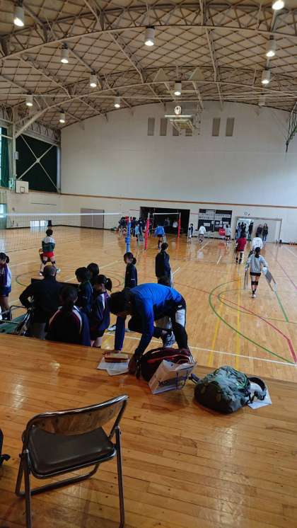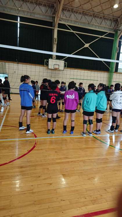 女子バレーボール部は大平中でトレセンです。今日はたくさんのチームと合同で行います。全員で整列し、話を聞いています。
