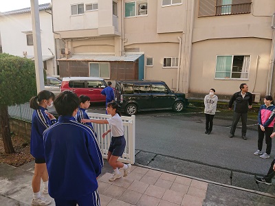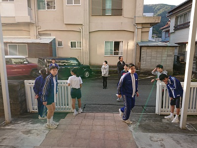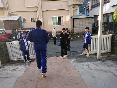 生活健康委員の生徒と教員、保護者が玄関先で「朝のあいさつ運動」を行いました。生徒同士で元気に声を掛け合っていました。