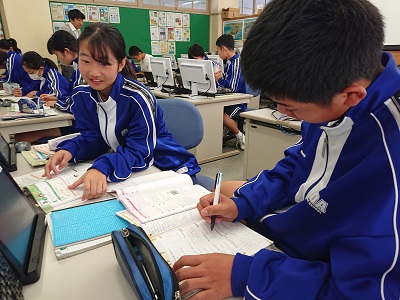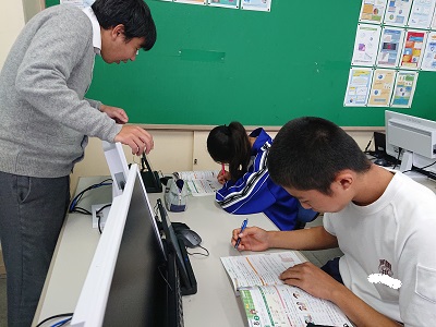 1年生は英語で助動詞canについて学習しています。英語で「〜できますか?」という文章の作り方を友達と一緒に考えていました。