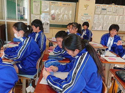 1年生は道徳で「決勝戦」というモラルジレンマ資料を使って、主人公の立場だったらどうするかを心情円を用いながら考え、話し合いました。心情円はみんな少しずつ違っていましたので、話し合いも活発になりました。