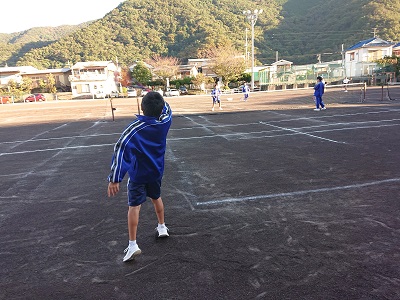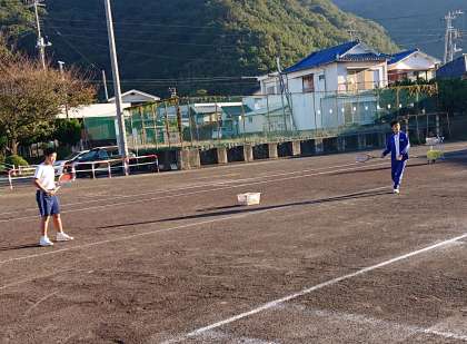 ソフトテニス部の朝練習の様子です。早い時間から準備をはじめ、練習を意欲的に行っています。